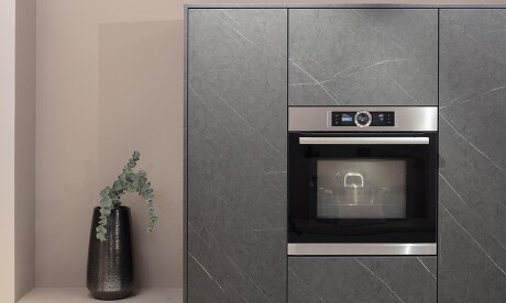 Sie überlegen gerade, in welcher Farbgebung Sie Ihre neue Küche gestalten möchten? Oder geht es zur Zeit darum, die Wände in Ihrer Küche neu zu streichen, und die vorhandenen Küchenfronten sind bereits in Grau gehalten? Dann ziehen Sie unbedingt auch diese Wandfarbe in Erwägung: Altrosa. Es passt deswegen so gut zu jedem Grauton – ob uni oder Steindekor – weil Altrosa selbst Grauanteile enthält. Deswegen harmoniert es so schön mit grauen Fronten. Mehr als das hat die Kombination von Grau und Altrosé sehr viel Stil und Klasse, strahlt Eleganz aus und zugleich Weichheit und Wohnlichkeit. Einbaugeräte mit Edelstahlfronten machen sich sehr gut dazu wie das gezeigte Küchenbeispiel mit dem im Highboard eingebauten Backofen zeigt.