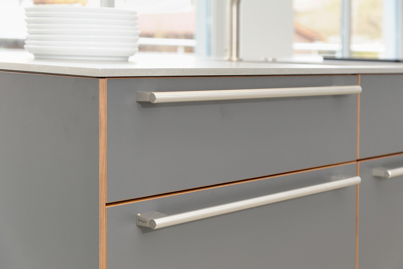 Wenn Einbauküchen edel aussehen sollen, darf nichts wuchtig wirken. Klotzige Arbeitsplatten werden in solchen Fällen gerne durch dünne Tischplatten ersetzt, die trotzdem enorm robust sind.