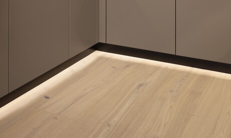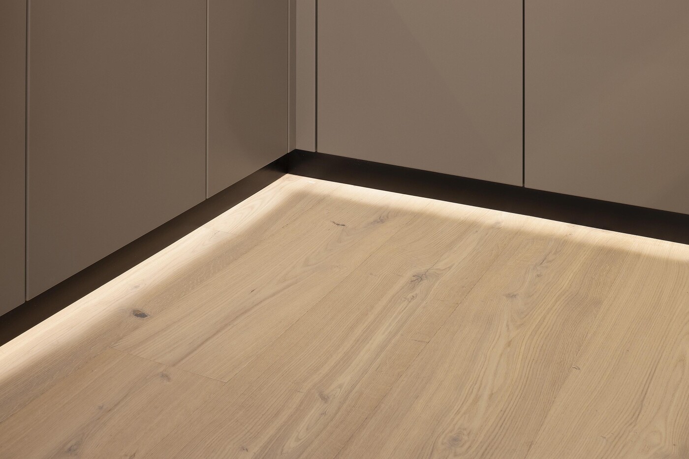 Besonders gut harmoniert diese Sockelbeleuchtung mit glatten, modernen Fronten in Matt oder Hochglanz, egal ob Weiß, Schwarz oder in trendigen Farben wie Fjordblau. Bei grifflosen Küchendesigns kommt der schwebende, buchstäblich abhebende visuelle Effekt am besten zur Geltung. Optimal wirken die LED Stripes bei einer Sockelhöhe von etwa 10 bis 15 cm – so kann sich das Licht am wirkungsvollsten auf dem Küchenboden darunter entfalten.