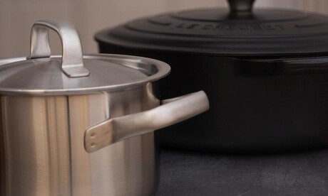 Edelstahl, Gusseisen, Emaille oder Aluguss – welcher Topf ist am besten? Auf jeden Fall der mit dem besten Boden. Dieser muss dick sein und beim Erhitzen plan auf dem Kochfeld aufliegen. Nur dann kann die Wärme gleichmäßig verteilt werden. Gute Ergebnisse erzielt man mit einem Sandwichboden, der aus verschiedenen Schichten aufgebaut ist.