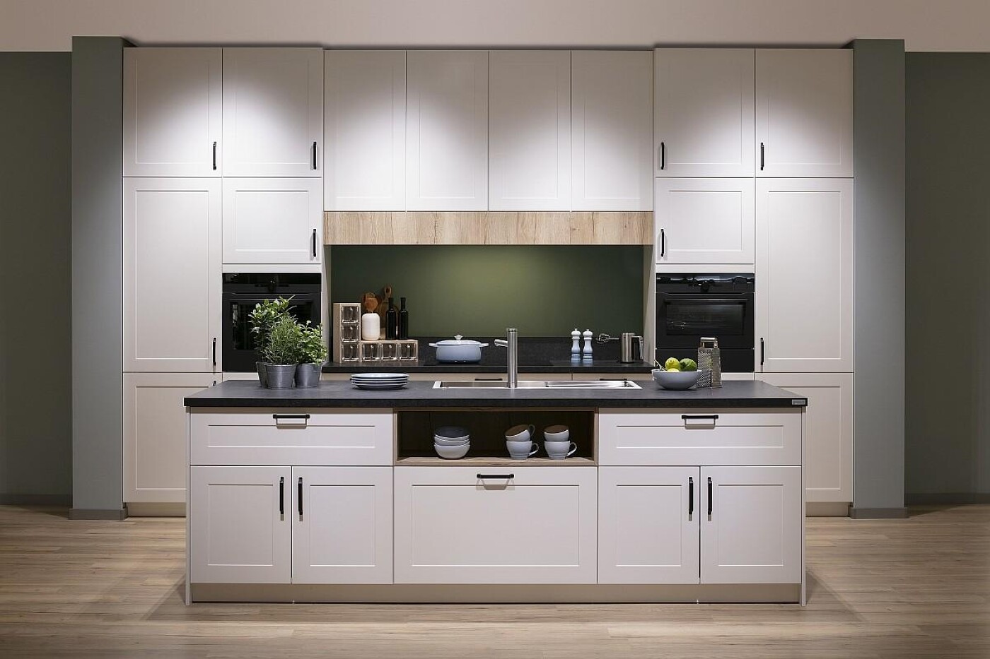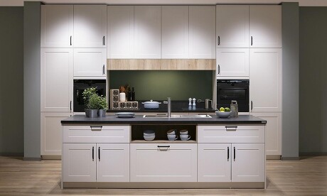 Die Geräteaufteilung folgt dieser harmonischen Komposition gleichfalls wie auch die farbliche Hervorhebung dank weißer Fronten vor den in hellem Taubenblau gestrichenen Wänden. Zum gelungenen Fokus auf diese ausgewogene Geometrie passen natürlich gerade auch Kassettenfronten gut.