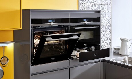 Machen Sie Ihre Schön-Wetter-Küche einfach zum Dauerbrenner, indem Sie sich trauen, ein paar der Küchenschränke mit sonnengelben Fronten zu gestalten. Das Beispiel zeigt, wie toll das aussieht – gerade in Kombination mit Grau oder/und schwarz.