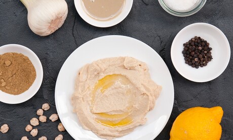 Nehmen Sie den Inhalt von zwei Dosen Kichererbsen und pürieren Sie diese. Währenddessen geben Sie 4 Esslöffel Tahini (Sesampaste, gibt es mittlerweile in gut sortierten Supermärkten), 4 Esslöffel Zitronensaft einen Schuss Olivenöl und zwei Knoblauchzehen dazu und pürieren Sie alles ganz fein. Das war es eigentlich auch schon – Sie können den Hummus noch mit Salz, Pfeffer, Kreuzkümmel oder Chili würzen, wenn Sie wollen. Decken Sie die Paste ab und lassen Sie sie 30 Minuten ruhen. Im Kühlschrank hält Hummus einige Tage.