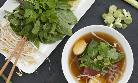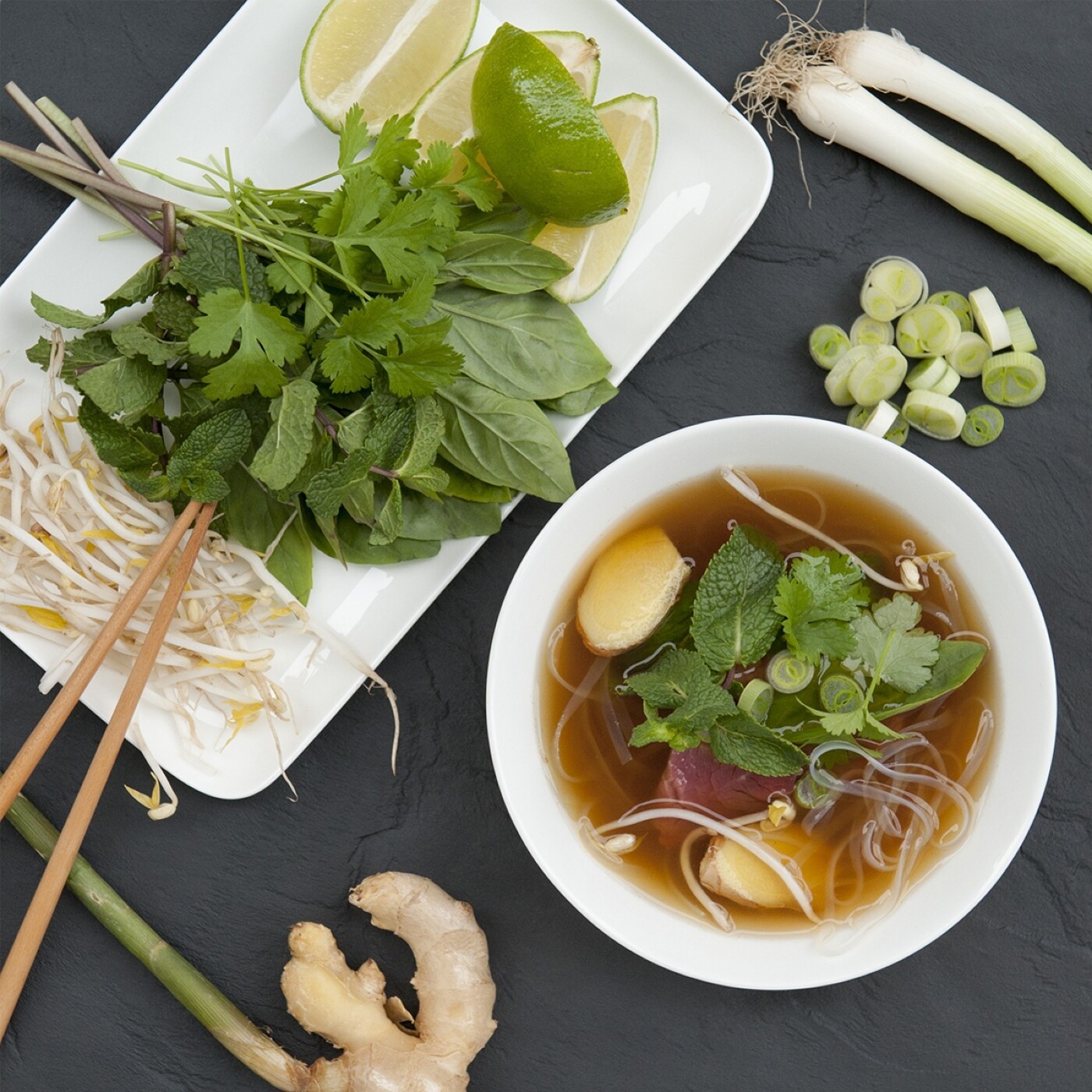 Pho wird im Land der Drachen sogar zum Frühstück gegessen. Die vietnamesische Nudelsuppe besteht aus einer kräftigen Rinderbrühe mit Rinder- (Pho Bo) oder Hühnerfleischstückchen (Pho Ga). Auch ein paar Spritzer Fischsauce sind enthalten, Reisnudeln, Frühlingszwiebeln, Koriandergrün, Minze und frische Sprossen.