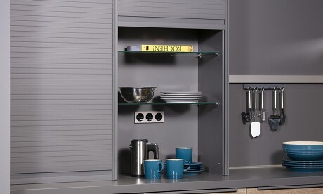 Das nebenstehende Küchenbeispiel zeigt, wie praktisch das ist: Vieles, das man täglich benötigt, kann hier schmutzsicher und trotzdem griffbereit verstaut werden. Und die Jalousie arretiert an jeder Stelle, kann also halb, ganz oder nur zu einem Drittel aufgeschoben werden. Ganz ohne dass im geöffneten Zustand Türen im Weg sind :-)