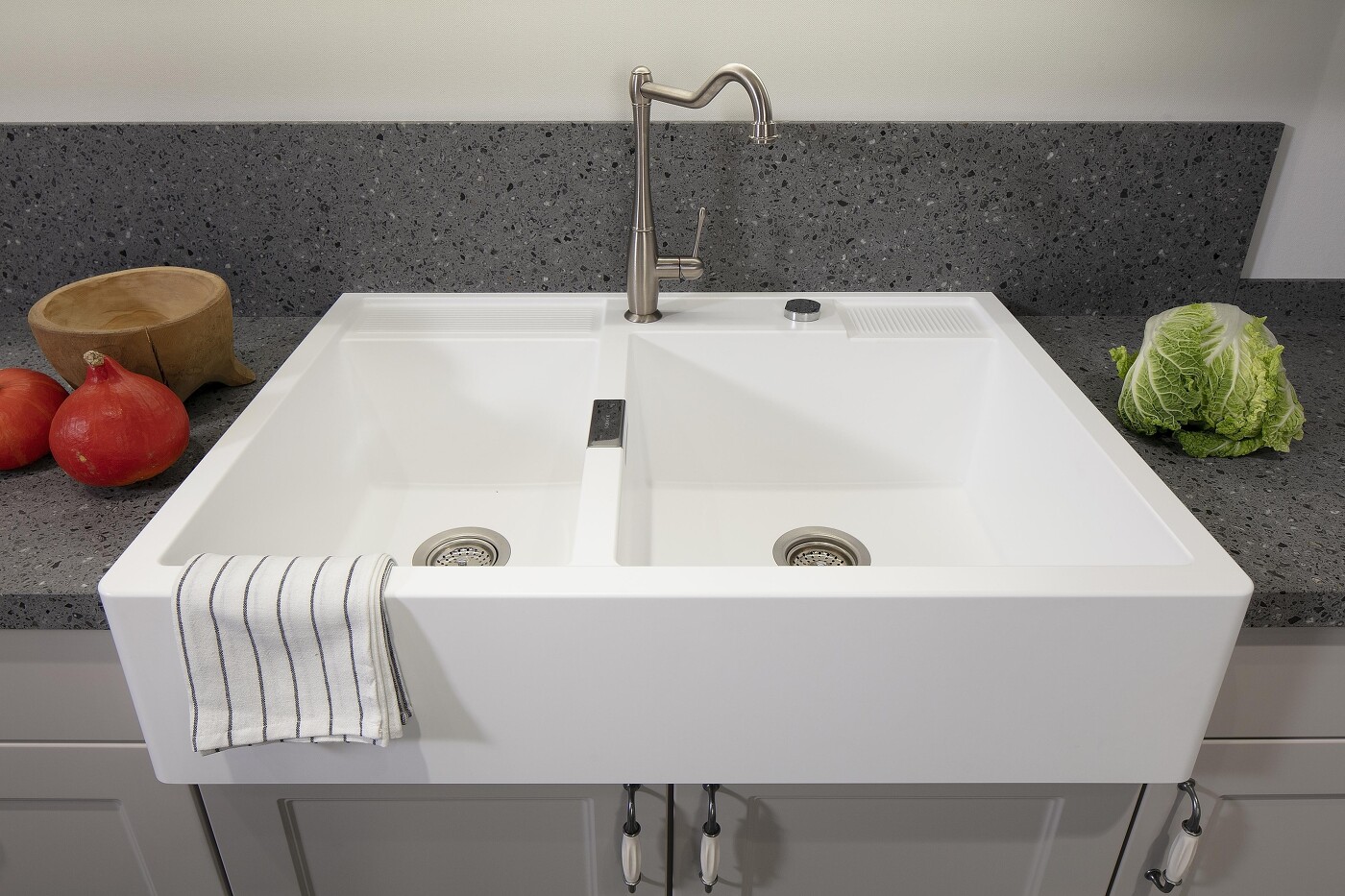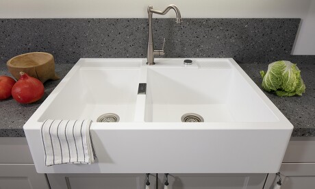 Nicht ohne Grund ein traditionelles Kücheninventar: Hochwertige Keramikspülen sind wirklich hart im Nehmen. Das Steinzeug ist den hohen Anforderungen, die an Küchenmaterialien gestellt werden, bestens gewachsen. Es ist pflegeleicht, strapazierfähig, hygienisch, druckfest, schlagfest und unempfindlich gegen Feuchtigkeit und Haushaltschemikalien aller Art. Auch Messerschneiden sind einem solchen Spülstein nicht gewachsen und können, daran aufschlagend, stumpf werden. Weiße Keramik bekommt allerdings schnell Flecken und nimmt auch Metallabrieb von Edelstahltöpfen schnell an. Hier also besser Vorsicht walten lassen und z. B. keine Schwarztee-Beutel darin abtropfen lassen. Ist es schon geschehen, können Sie sich getrost mit rauher Schwammseite, Natron oder auch Cerankochfeldreiniger an die Fleckenentfernung wagen.