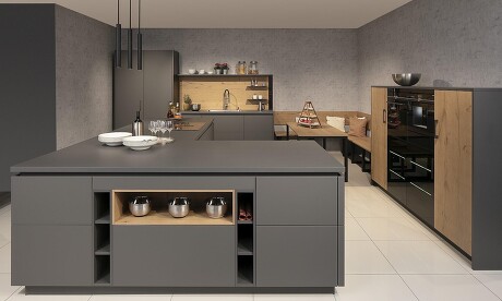 Das gezeigte Beispiel der mattgrauen L-Kücheninsel zeigt, dass diese sich auch sehr gut für offene Küchen eignet: Die zum Wohnraum hin zeigende L-Seite wird mit offenen Regalfächern versehen, in die man dekoratives Geschirr stellen kann, was gleich eine wohnliche Atmosphäre verbreitet.