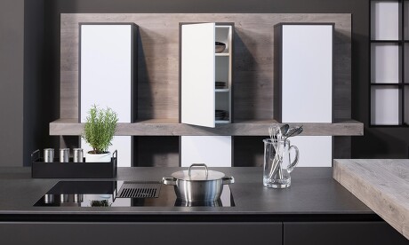 Kubistische Gestaltung kennzeichnet diese Komposition aus symmetrisch gehängten grifflosen Küchenschränken, die sich auf Antippen öffnen. Die drei weißen Hängeschränke wirken vor der Holzwand im breiten schwarzen Rahmen wie skulpturale Designobjekte. Stauraumschaffung steht für Liebhaber solchen Küchendesigns nicht im Vordergrund. Hier geht es um puristische Ästhetik in einer auf das Wesentliche reduzierten Formensprache.