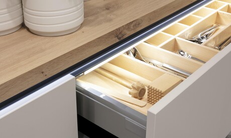 Sieht nicht nur schön aus, ist auch noch äußerst praktisch: Schubladenbeleuchtung, die beim Aufziehen der Lade bewegungsaktiviert angeht und beim Schließen wieder abschaltet. Auf diese Weise haben Sie sofort einen klareren Blick für das was drin ist.