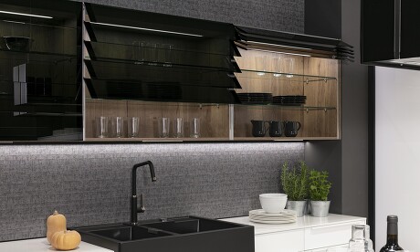 Gepaart mit den darüber angebrachten Glas-Lamellen-Schränken kommt diese elegante Schwarz-Weiß-Gestaltung besonders gut zum Tragen. Wenn es genau solche Küchenideen sind, die Sie sich von Ihrem Küchenstudio wünschen, sind Sie bei uns an der richtigen Adresse!