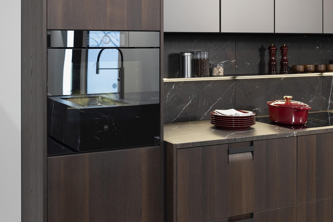 Je nach Positionierung spiegeln die Gerätefronten gegenüberliegende Küchenbereiche wider, beispielsweise das Fenster oder den beleuchteten Esstisch. So entsteht ein faszinierendes Spiel aus Licht, Tiefe und Perspektive.