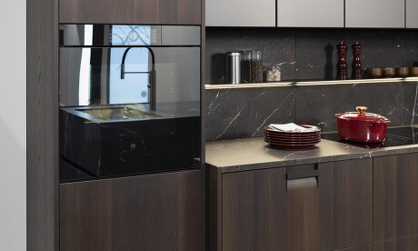Die Bedienelemente des Ofens sind in das Glas eingraviert. Sie erwachen bei Berührung zum Leben und unterstützen den Garvorgang mit künstlicher Intelligenz. Auch bei diesem Einbaugerät lassen sich über das Display Rezepte abrufen, die der Backofen automatisch auf die gewünschten Garphasen anwendet.