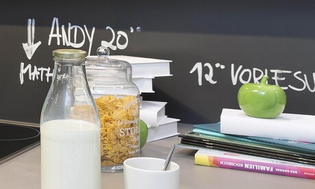 Die Küche ist meist das Kommunikationszentrum in der Wohnung, und es gibt ein einfaches, dekoratives, kommunikatives Mittel, das zu verstärken: Tafelfarbe! Damit können Sie jede ebene Fläche – ob Wand oder Tür oder Nischenrückwand – in ein wahrhaft „Schwarzes Brett“ verwandeln. Für Einkaufszettel, Rezeptideen, kreative Ausbrüche, Notizen an die Familie, Gestaltungsraum für die Kleinen. So einfach. So gut.