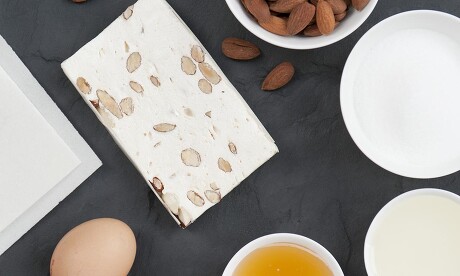 In Italien heißt es Torrone, in Frankreich und bei uns Nougat: ein Konfekt aus Honig, Zucker, Eiweiß und Mandeln. Kochen Sie 100g Honig, 80g Glukosesirup, 250g Zucker und 100 ml Wasser so lange ein, bis eine zähe Masse entsteht. Parallel schlagen Sie 2 Eiweiß sehr steif. Rühren Sie die heiße Honigmasse langsam in den Eischnee und schlagen Sie diesen dann nochmals mindestens 20 Minuten auf. Am Ende kommen 300g ganze, geschälte und geröstete Mandeln dazu. Streichen Sie die Masse auf Oblaten, bedecken Sie das Ganze wieder mit Oblaten und lassen Sie es abkühlen.